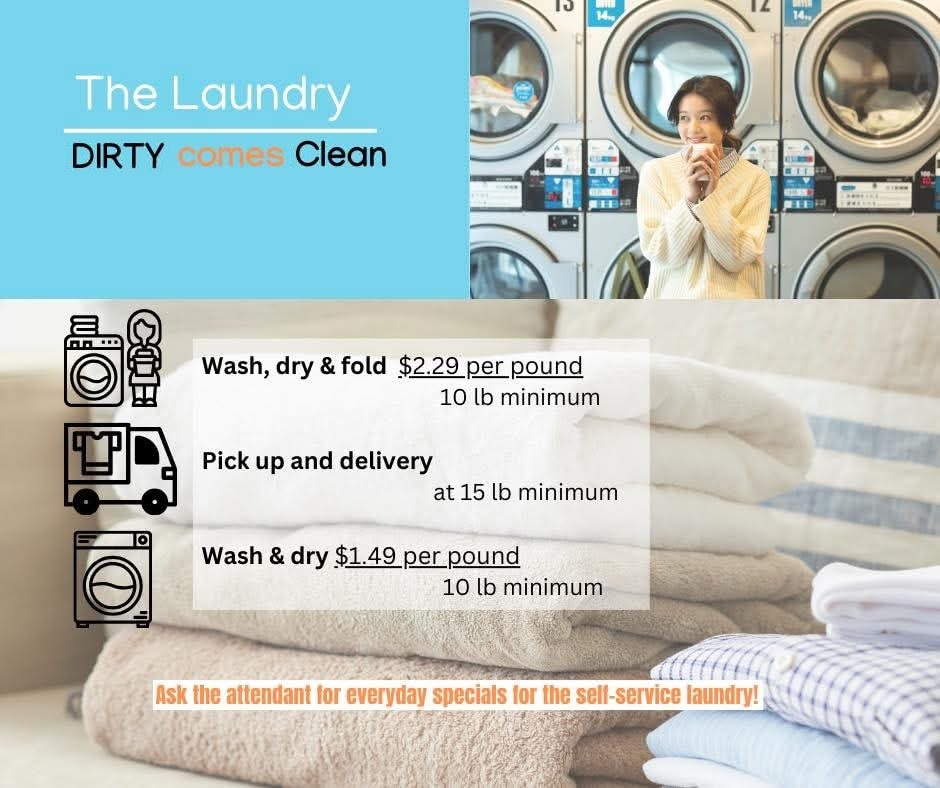Just come in to our Dirty Comes Clean and drop off your clothes with an attendant, then simply stop back when your laundry is complete.